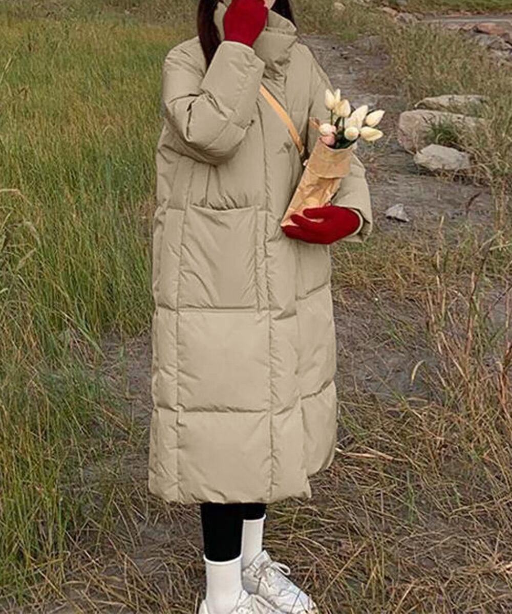すっぽりハイネック付きで暖かく、ゆったりめのエコダウンロングコート。