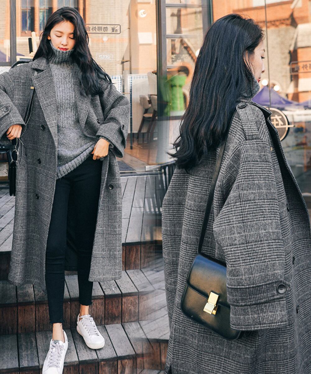 グレンチェックコート秋冬 カジュアルきれいめ オーバーサイズロングコート ダブルブレスト 暖かいアウター バックスリット