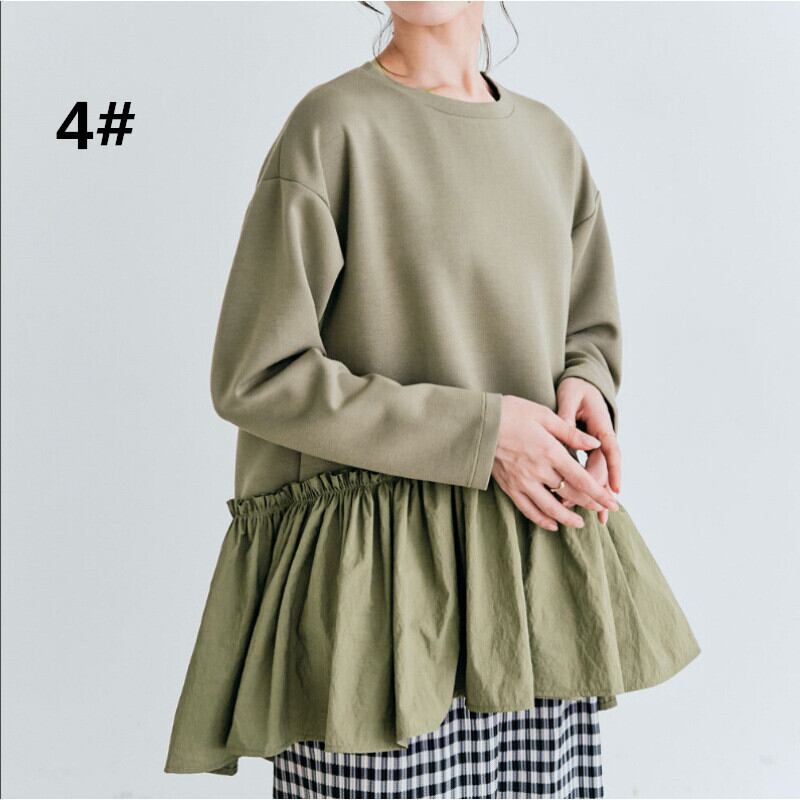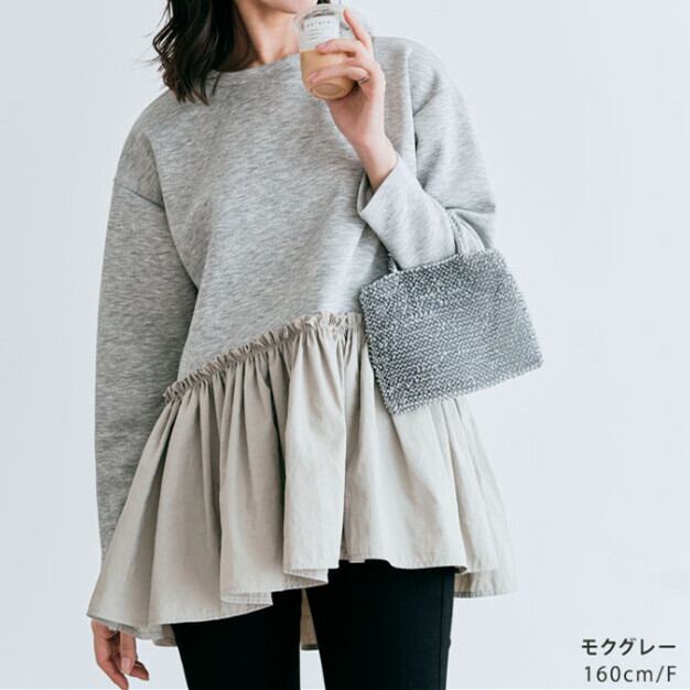 トップス レディース プルオーバー 長袖 ラウンドネック 異素材 大きいサイズ