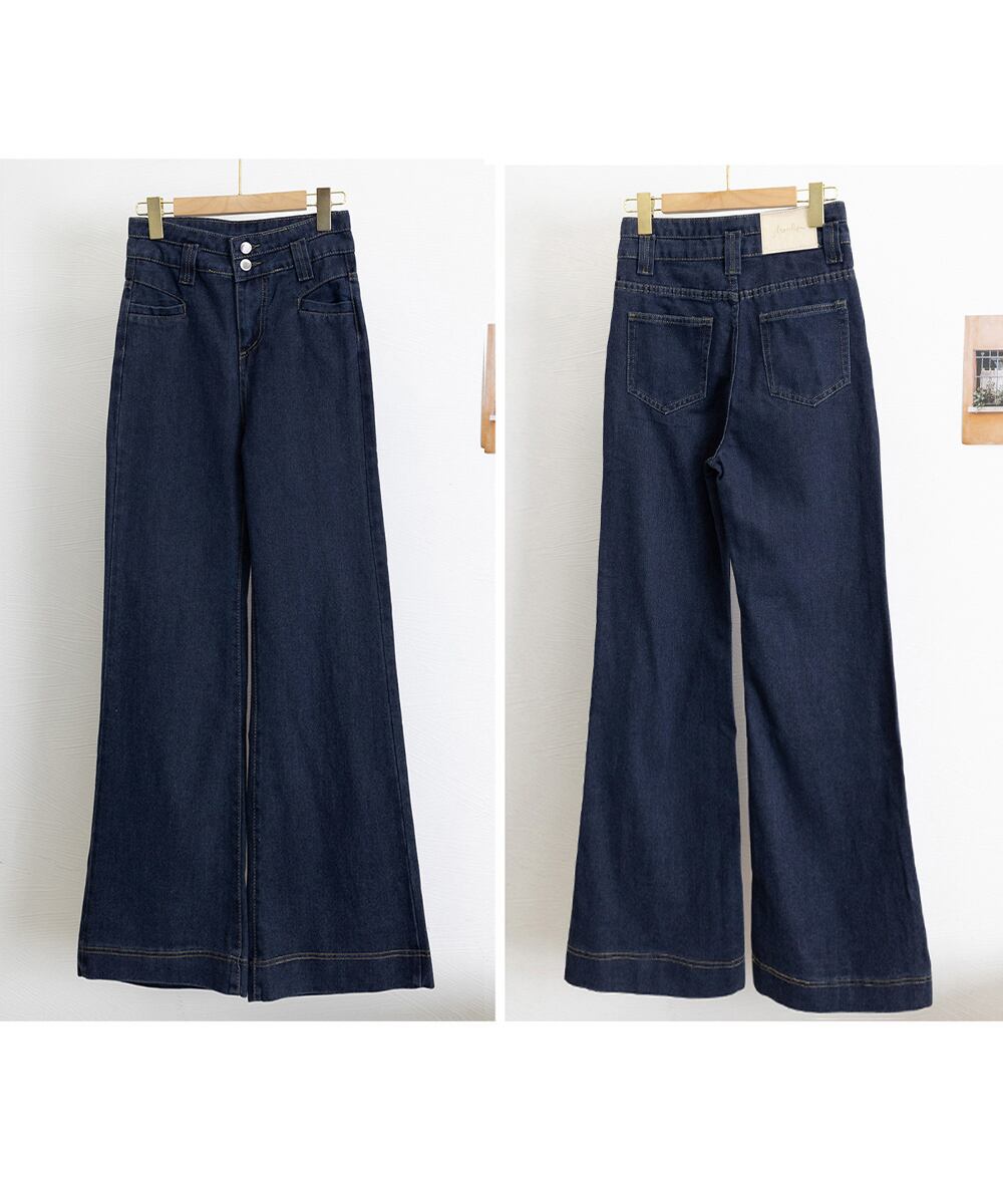 裾に向かってゆるやかに広がるワイドシルエットが、脚をスラっと美しく見せるデニムパンツ